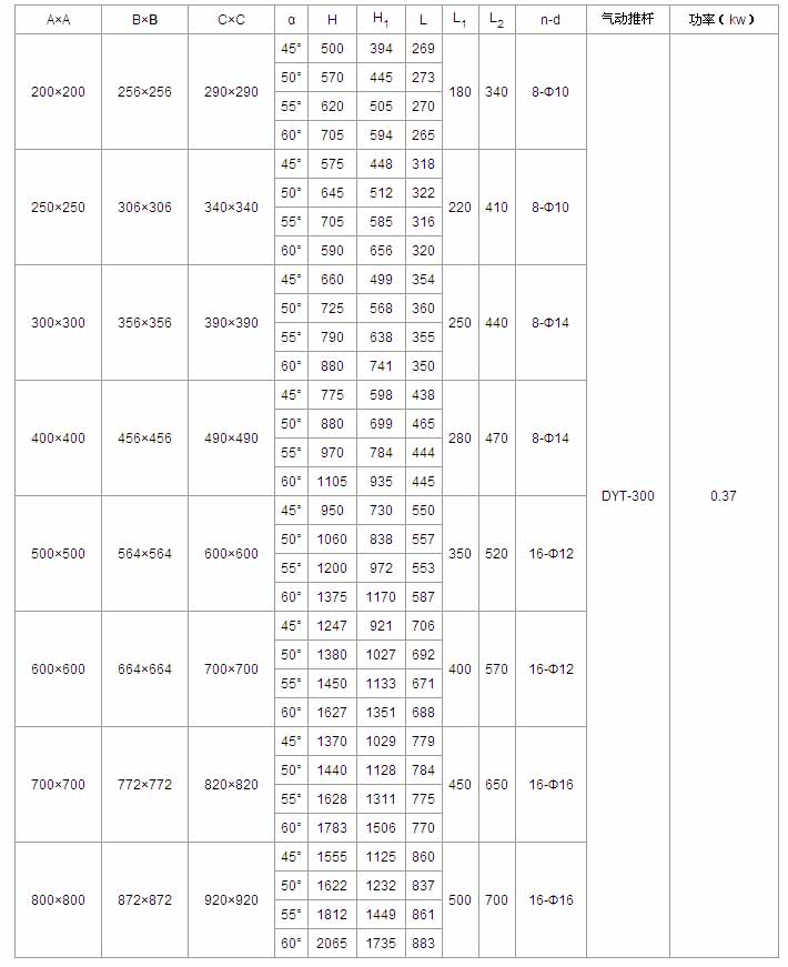 A×A | B×B | C×C | α | H | L | L1 | L2 | n-d | 電動裝置 | 功率(kw) |