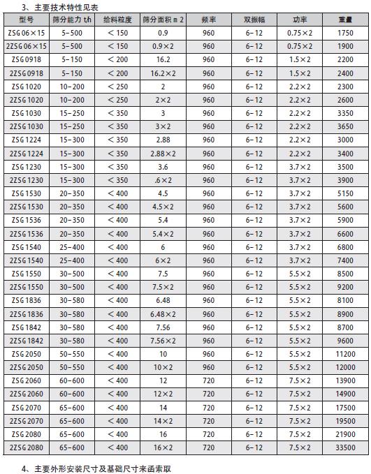 1、型號(hào)編制說(shuō)明:2、ZSG系列高效重型振動(dòng)篩的分類(lèi)及用途: